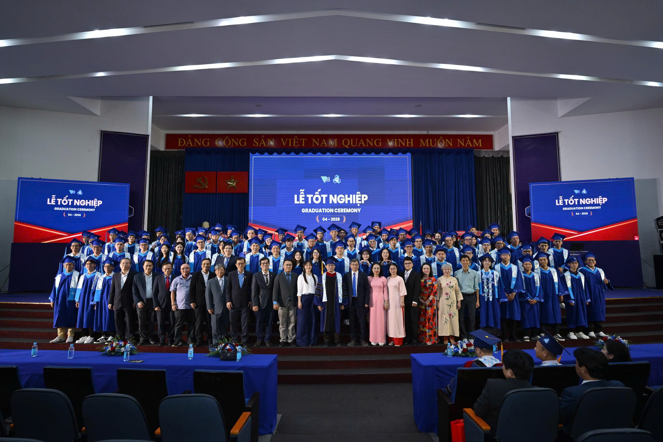 Không khí buổi lễ trang trọng nhưng cũng đầy xúc động khi những cái tên lần lượt được xướng lên, đánh dấu sự trưởng thành của từng sinh viên sau những năm tháng miệt mài học tập. Các tân Kỹ Sư, tân Cử Nhân, trong niềm hân hoan, tự hào và nhiều cảm xúc, đã lần lượt tiếp bước lên lễ đài để nhận bằng tốt nghiệp, đánh dấu một bước ngoặt quan trọng khép lại đời sinh viên để hội nhập vào đội ngũ nhân lực chất lượng cao phục vụ cộng đồng, cống hiến cho đất nước, tiến bước vào kỷ nguyên mới “Kỷ nguyên vươn mình của dân tộc Việt Nam”.