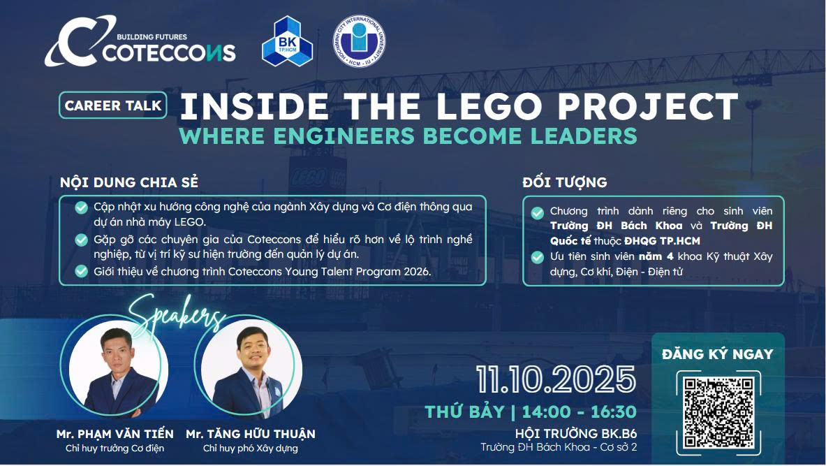 Đó không chỉ là câu chuyện xây dựng một nhà máy, đó là câu chuyện về kỹ sư đã chinh phục được tầm vóc toàn cầu! Và lần đầu tiên, Coteccons mang câu chuyện ấy đến với Career talk – INSIDE THE LEGO PROJECT: WHERE ENGINEERS BECOME LEADERS.
