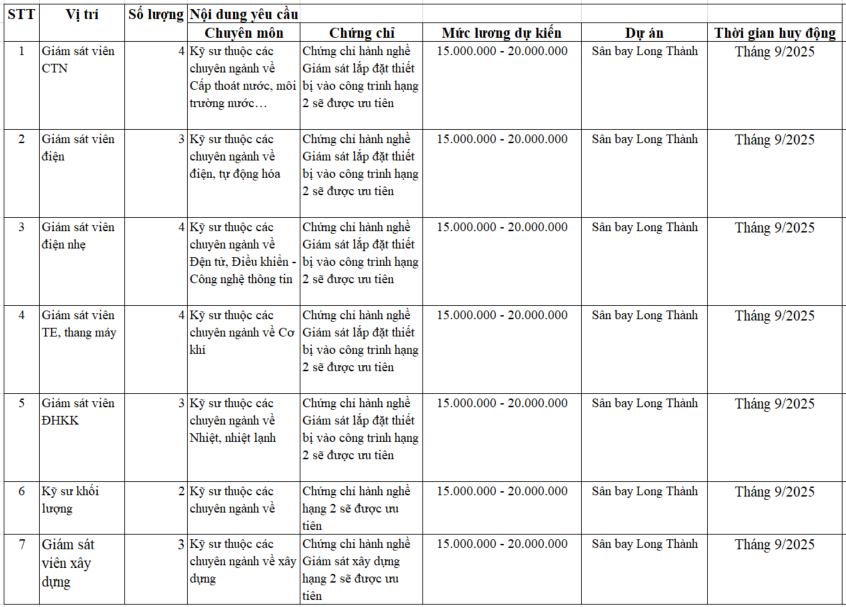 Hiện nay công ty đang cần tuyển các vị trí sau làm việc tại dự án sân bay Long Thành trong tháng 9/2025 với mức lương dự kiến 15-20 triệu vnd.