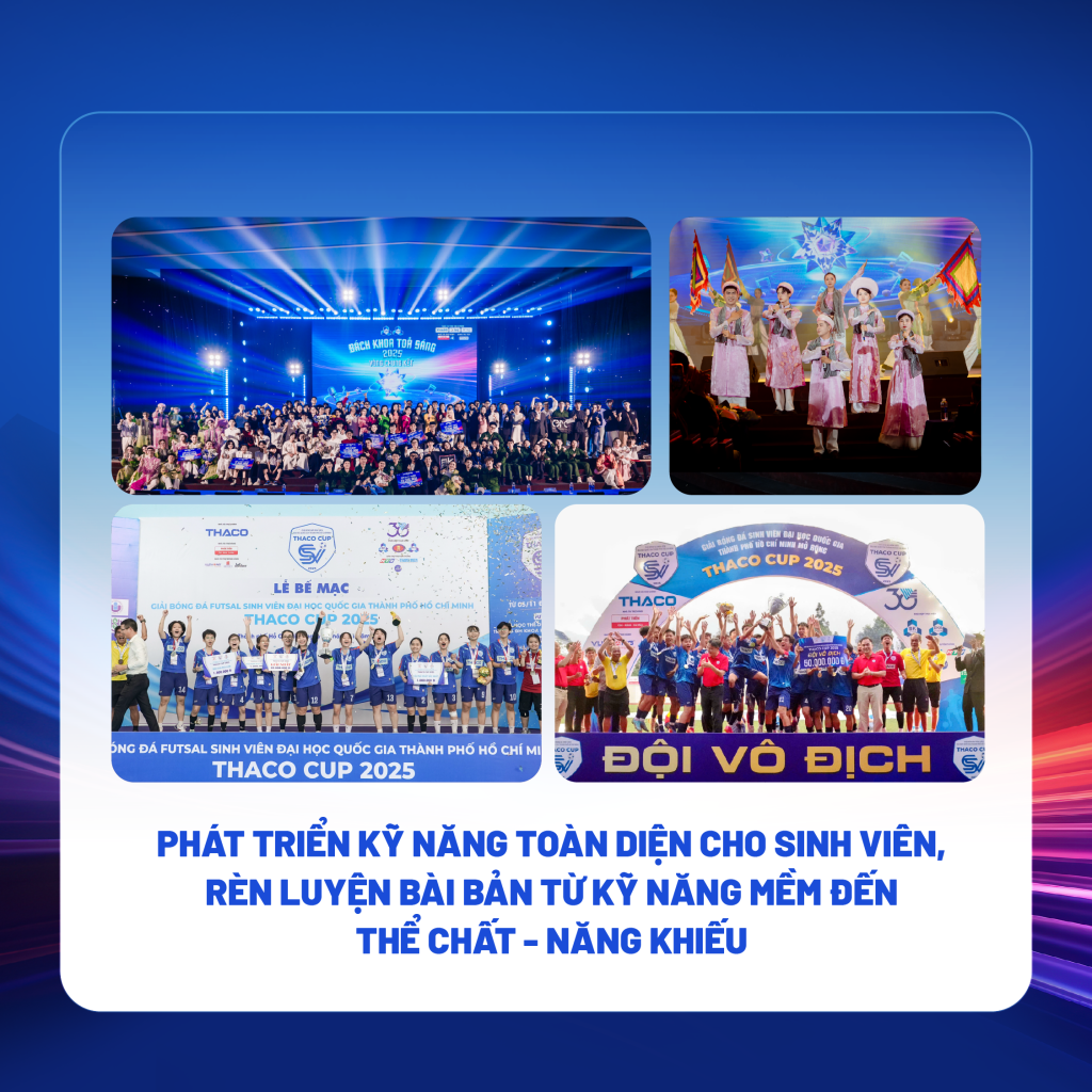 2025 tiếp tục ghi nhận những điểm sáng trong phong trào thể thao học đường khi đội tuyển trường xuất sắc giành liên tiếp giải Vô địch bóng đá nam ĐHQG-HCM mở rộng – THACO CUP 2025 và giải Vô địch bóng đá nữ Futsal Sinh viên ĐHQG-HCM – THACO CUP 2025.