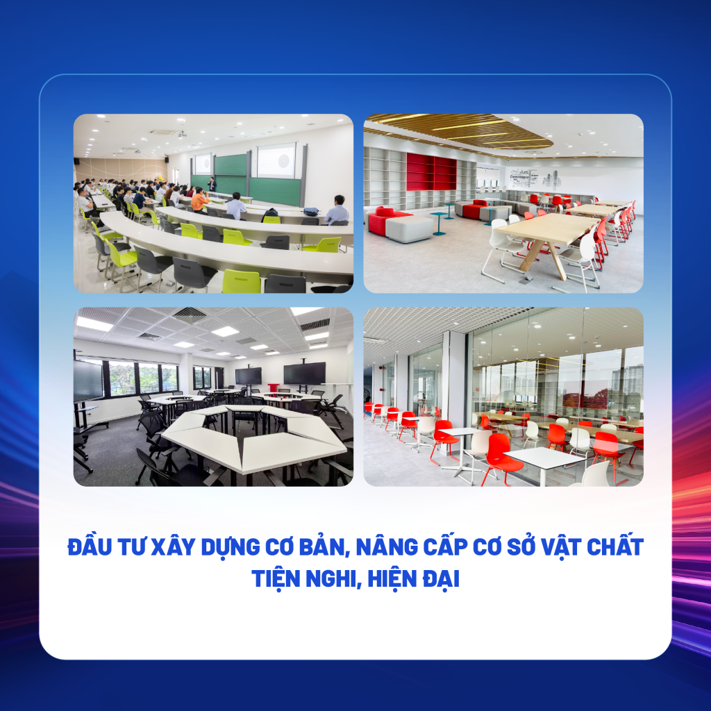 Trường tập trung nguồn lực hiện đại hóa cơ sở vật chất tại hai cơ sở đào tạo và tại ký túc xá, bao gồm việc cải tạo các tòa nhà, phòng học, hội trường, căn tin, sân thể dục thể thao, không gian đào tạo liên kết quốc tế (UTS, KLU) và tích hợp tiện ích sinh hoạt tại các không gian xanh ngoài trời.