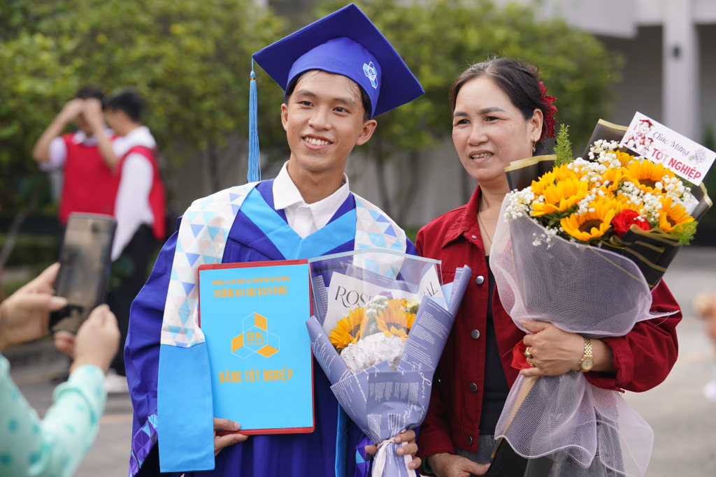 Không khí buổi lễ trang trọng nhưng cũng đầy xúc động khi những cái tên lần lượt được xướng lên, đánh dấu sự trưởng thành của từng sinh viên sau những năm tháng miệt mài học tập. Tại chương trình lễ bậc Đại học, Nhà trường đã vinh danh và khen thưởng 13 sinh viên tốt nghiệp trước hạn có thành tích nổi bật, trong đó có 01 sinh viên xếp loại xuất sắc; 01 sinh viên hệ VLVH có thành tích học tập đứng đầu khóa học; đồng thời trao bằng cho các tân khoa chương trình Tài năng, chương trình Kỹ sư Chất lượng cao tại Việt Nam và các tân khoa có điểm trung bình tốt nghiệp từ 3.2 trở lên.