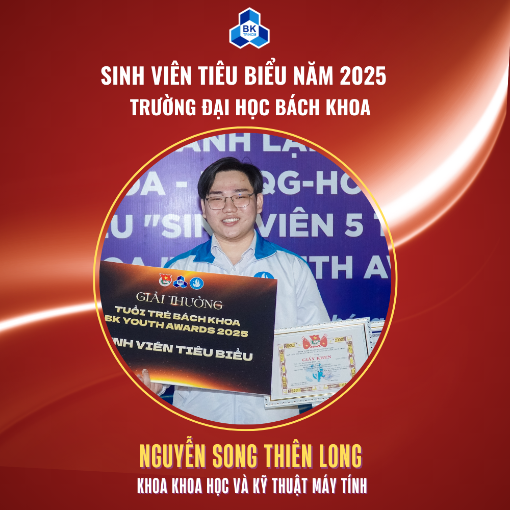 Giải thưởng Sinh viên tiêu biểu năm 2025 do Đoàn Thanh niên – Hội Sinh viên trường ĐH Bách khoa – ĐHQG-HCM trao cho cá nhân xuất sắc trên nhiều phương diện: học tập, nghiên cứu, phong trào sinh viên và đóng góp cộng đồng. Năm nay, Nguyễn Song Thiên Long, sinh viên Khoa Khoa học và Kỹ thuật Máy tính vinh dự được xướng tên ở danh hiệu này.