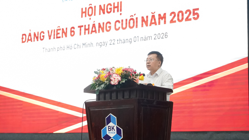 Sáng ngày 22/1/2026, Ban Chấp hành Đảng bộ Trường Đại học Bách khoa long trọng tổ chức Hội nghị Đảng viên 6 tháng cuối năm 2025 nhằm tổng kết, đánh giá việc thực hiện các nhiệm vụ do Đảng ủy Trường lãnh đạo, chỉ đạo triển khai và cấp ủy cấp trên giao trong năm 2025, đề ra phương hướng, nhiệm vụ trọng tâm triển khai trong năm 2026; tổ chức khen thưởng các tập thể và cá nhân xuất sắc trong các phong trào thi đua; đồng thời triển khai quán triệt Chương trình hành động thực hiện Nghị quyết Đại hội đại biểu Đảng bộ Thành phố Hồ Chí Minh lần thứ I, nhiệm kỳ 2025 – 2030.