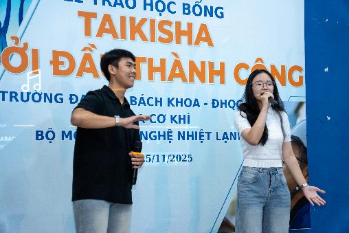 Song song với phần trao đổi chuyên môn, Công ty TNHH Kỹ Thuật Taikisha Việt Nam cũng trao tặng các phần học bổng nhằm ghi nhận thành tích học tập tốt của các bạn sinh viên ngành Kỹ thuật Nhiệt. Những phần học bổng này không chỉ thể hiện sự quan tâm của doanh nghiệp đối với thế hệ kỹ sư Nhiệt lạnh tương lai mà còn là nguồn động lực thiết thực để sinh viên ngành Kỹ thuật Nhiệt tiếp tục theo đuổi con đường học tập và phát triển nghề nghiệp.