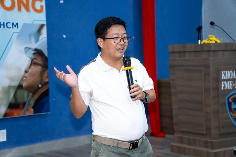 Tiếp theo, TS. Hà Anh Tùng, Chủ nhiệm Bộ môn Công nghệ Nhiệt lạnh, Khoa Cơ khí, Trường Đại học Bách khoa – ĐHQG-HCM, đã phát biểu khai mạc, bày tỏ niềm vui khi tiếp tục đồng hành cùng Công ty TNHH Kỹ Thuật Taikisha Việt Nam trong các hoạt động giao lưu học thuật. TS. Hà Anh Tùng đã đại diện Bộ môn Công nghệ Nhiệt lạnh gửi lời cảm ơn sâu sắc đến Công ty TNHH Kỹ Thuật Taikisha Việt Nam vì sự hỗ trợ dành cho sinh viên ngành Kỹ thuật Nhiệt trong nhiều năm qua, từ các phần học bổng thiết thực đến những cơ hội thực tập và tuyển dụng có giá trị. TS. Hà Anh Tùng cũng nhấn mạnh tầm quan trọng của việc đưa kiến thức thực tế vào môi trường đào tạo, giúp sinh viên ngành Kỹ thuật Nhiệt hiểu rõ hơn về yêu cầu, tiêu chuẩn và xu hướng của ngành.