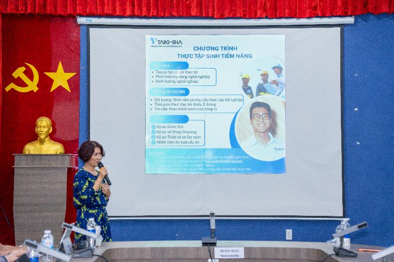 Trước khi bước vào phần hỏi đáp trực tiếp, bà Tống Thị Thu Minh, Trưởng phòng Nhân sự, Công ty TNHH Kỹ Thuật Taikisha Việt Nam, đã giới thiệu về chương trình thực tập và tuyển dụng dành cho sinh viên ngành Kỹ thuật Nhiệt. Đây là chương trình được thiết kế nhằm tạo cơ hội để sinh viên ngành Kỹ thuật Nhiệt trải nghiệm môi trường làm việc thực tế, được hướng dẫn bởi các kỹ sư Taikisha trong các dự án thiết kế – giám sát – thi công MEP. Đại diện công ty cũng chia sẻ về lộ trình phát triển nghề nghiệp rõ ràng dành cho những sinh viên ngành Kỹ thuật Nhiệt có mong muốn gắn bó và phát triển lâu dài tại Taikisha. Phần giới thiệu này đã thu hút sự quan tâm lớn từ sinh viên ngành Kỹ thuật Nhiệt, đặc biệt là những bạn đang tìm kiếm môi trường thực tập chuẩn mực, kỷ luật và mang tính định hướng nghề nghiệp cao.