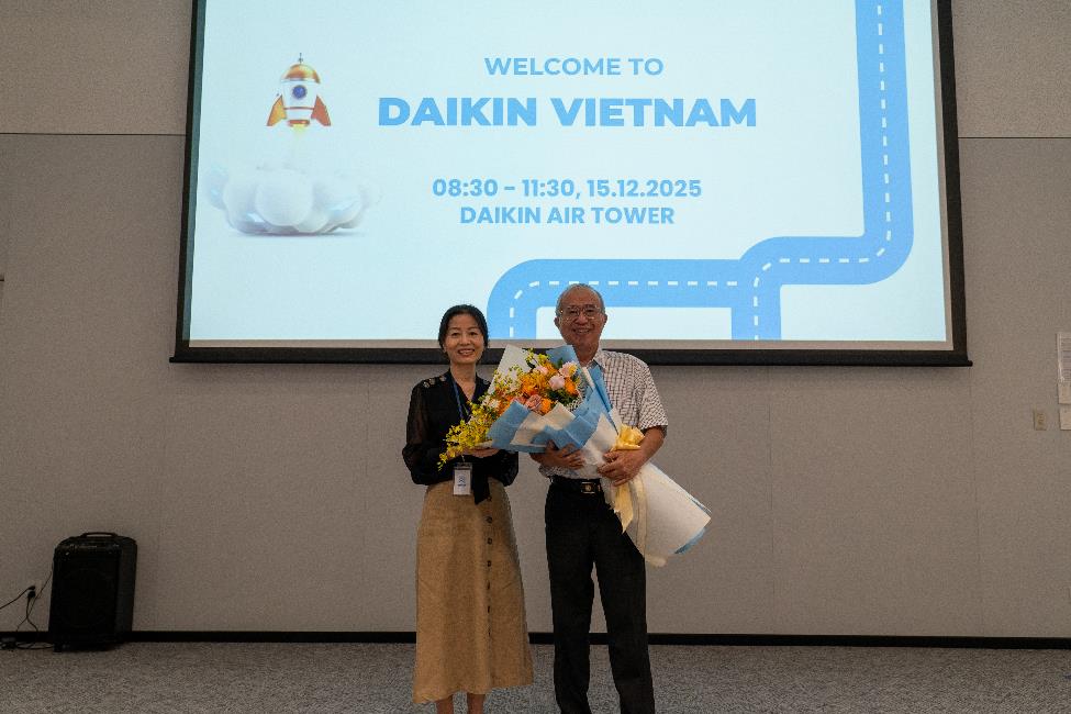 Hình 3: Bà Nguyễn Thanh Thủy, Giám Đốc Nhân sự Daikin Vietnam, trao tặng bó hoa chào mừng cho GS. TS. Lê Chí Hiệp, nguyên Chủ nhiệm Bộ môn Công nghệ Nhiệt lạnh, Khoa Cơ khí, Trường Đại học Bách khoa – ĐHQG-HCM.