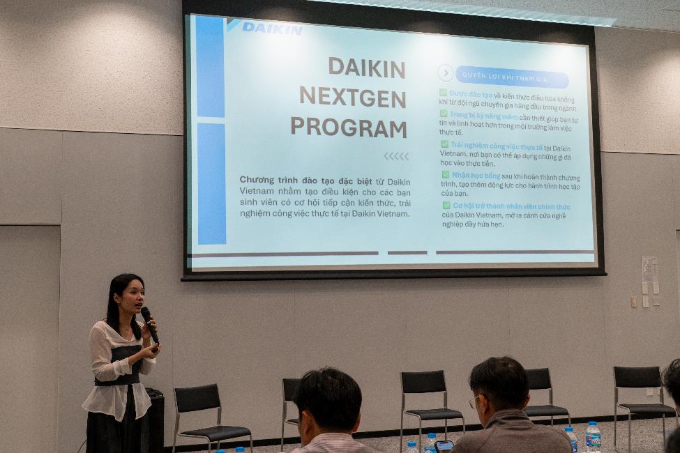 Song song với nội dung tham quan công trình, chương trình còn lồng ghép giới thiệu Daikin NextGen Program, chương trình đào tạo hướng đến việc trang bị cho sinh viên những kiến thức thực tiễn, kỹ năng mềm, trải nghiệm môi trường làm việc chuyên nghiệp và định hướng nghề nghiệp rõ ràng trong lĩnh vực điều hòa không khí. Thông qua các chia sẻ từ đội ngũ kỹ sư và chuyên gia Daikin, sinh viên có cơ hội hiểu rõ hơn về các mảng công việc như thiết kế, kỹ thuật, dịch vụ, hỗ trợ kỹ thuật và kinh doanh kỹ thuật, cũng như khả năng phát triển nghề nghiệp lâu dài tại Daikin Việt Nam sau khi hoàn thành chương trình đào tạo.