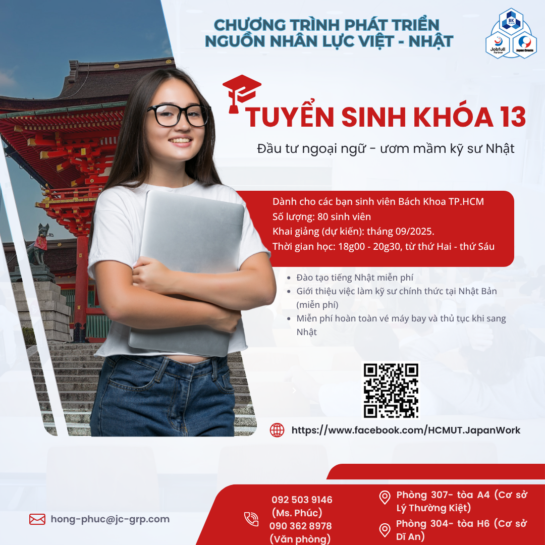 Chương trình Việt Nhật do Japan Create, đối tác lâu năm của Trường Đại học Bách khoa, chính thức tuyển sinh. Năm nay, lần đầu tiên, Japan Create miễn toàn bộ chi phí học tiếng Nhật và giới thiệu việc làm sau khi tốt nghiệp.